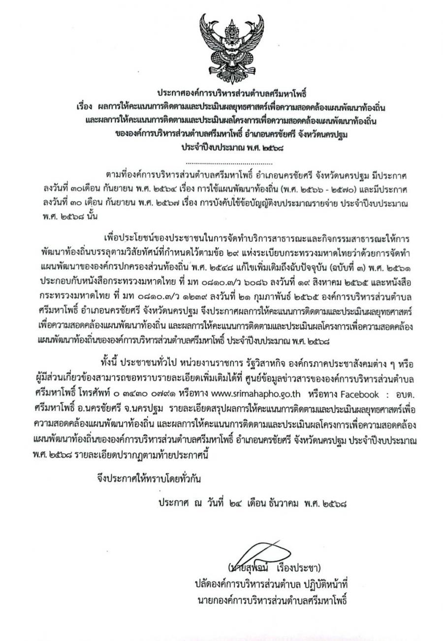 ประกาศองค์การบริหารส่วนตำบลศรีมหาโพธิ์ เรื่อง ผลการให้คะแนนการติดตามและประเมินผลยุทธศาสตร์ เพื่อความสอดคล้องแผนพัฒนาท้องถิ่น และผลการให้คะแนนการติดตามและประเมินผลโครงการเพื่อความสอดคล้องแผนพัฒนาท้องถิ่น ขององค์การบริหารส่วนตำบลศรีมหาโพธิ์ อำเภอนครชัยศรี จังหวัดนครปฐม ประจำปีงบประมาณ พ.ศ. 2568