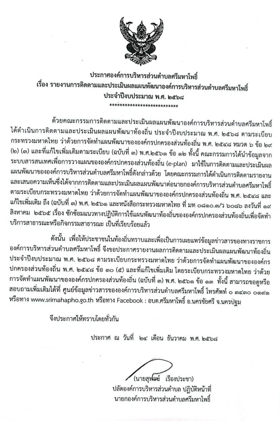 ประกาศองค์การบริหารส่วนตำบลศรีมหาโพธิ์ เรื่อง รายงานการติดตามและประเมินผลแผนพัฒนาองค์การบริหารส่วนตำบลศรีมหาโพธิ์ ประจำปีงบประมาณ พ.ศ. 2568