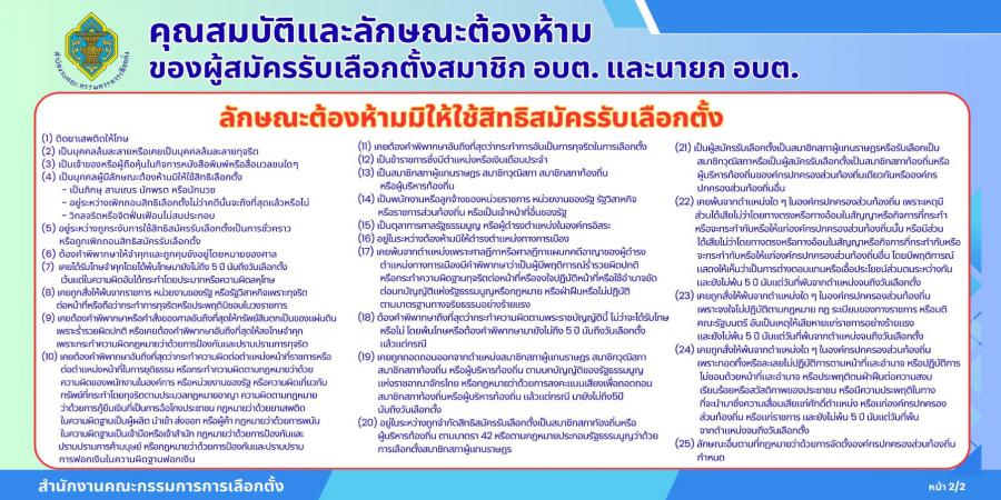 ประกาศคุณสมบัติและลักษณะต้องห้ามของผู้สมัครรับเลือกตั้งสมาชิกสภาองค์การบริหารส่วนตำบล และนายกองค์การบริหารส่วนตำบล
