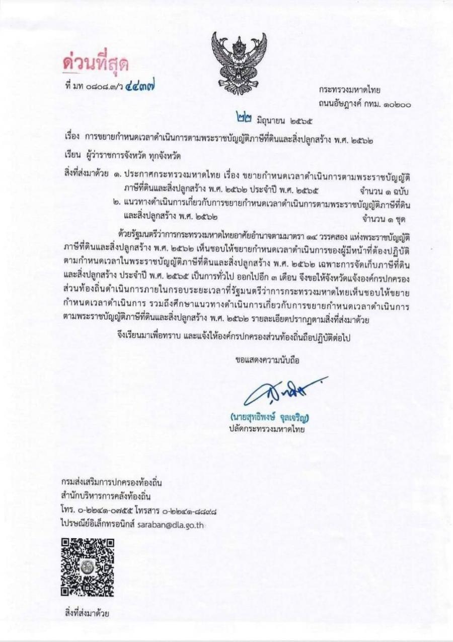 ประกาศขยายกำหนดเวลาดำเนินการตามพระราชบัญญัติภาษีที่ดินและสิ่งปลูกสร้าง พ.ศ. 2562 ประจำปี พ.ศ. 2565