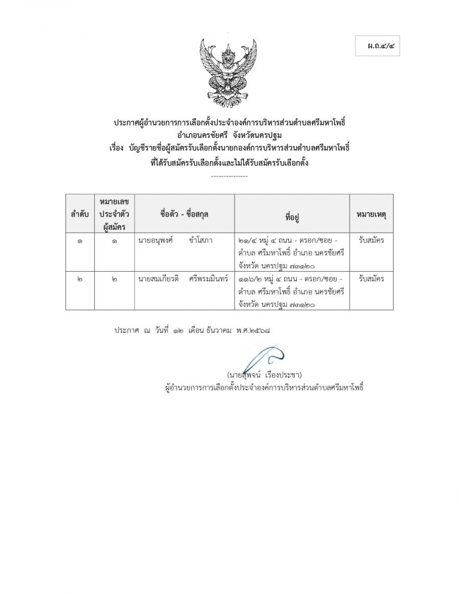 บัญชีรายชื่อผู้สมัครรับเลือกตั้งนายกองค์การบริหารส่วนตำบลศรีมหาโพธิ์ที่ได้รับสมัครรับเลือกตั้งและไม่ได้รับสมัครรับเลือกตั้ง